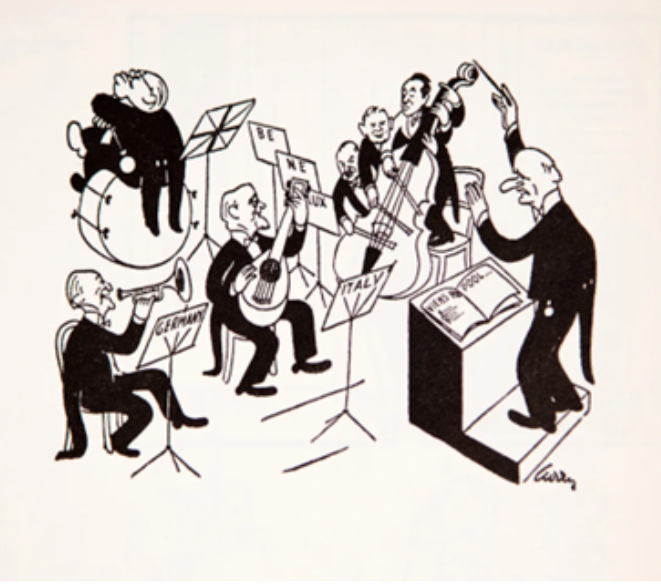 Caricature représentant Schuman en tant que chef d’orchestre des musiciens, qui sont les chefs des 6 gouvernements de la CECA. Churchill, le Premier Ministre britannique, est représenté de dos, refusant de jouer de son instrument et de participer.