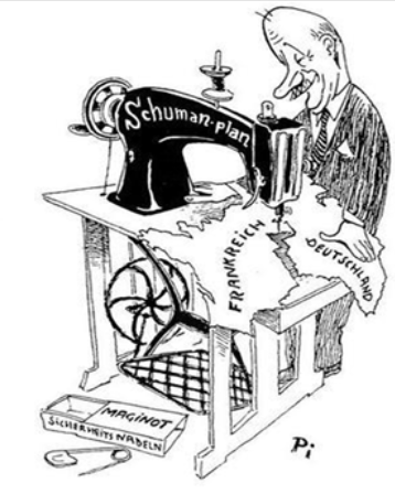 Après la déclaration du 9 mai 1950, le caricaturiste Pielert insiste sur l’importance du nouveau partenariat franco-allemand à la base du plan Schuman. “L’épingle de sûreté” en question est la ligne Maginot (en bas à gauche de l’image), construite entre 1928 et 1938 afin de protéger la France en cas d’attaque allemande, après les traumatismes de la Première Guerre mondiale.
