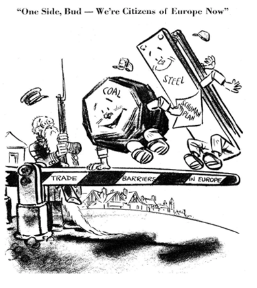 Un côté, l’ami – Nous sommes des citoyens européens maintenant.” Caricature représentant le charbon (“coal”) et l’acier (“steel”) sautant par dessus des “trade barriers in Europe” ou “barrières commerciales en Europe”.