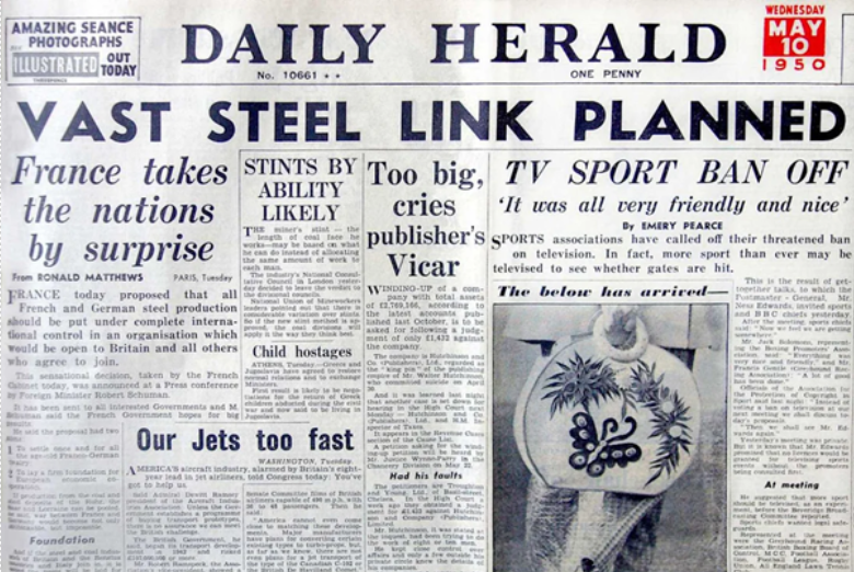 Journal britannique Daily Herald du 10 mai 1950 (au lendemain de la déclaration Schuman), “La France surprend les nations”