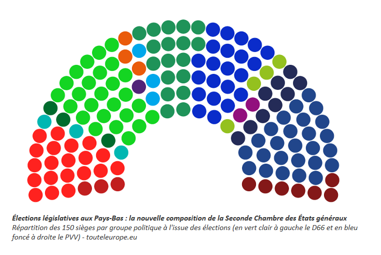 Le parti centriste D66 (Démocrates 66) s’oppose durant ces élections à la formation d’extrême droite PVV (Parti pour la liberté) de Geert Wilders. Alors qu’un premier sondage le 29 octobre annonçait le D66 comme vainqueur, une projection publiée le lendemain après le dépouillement de 99,7% des suffrages voit les deux formations politiques arriver en tête, chaque parti ayant 26 sièges sur 150 au Parlement néerlandais. Une longue période de négociations s’ouvre ainsi pour les partis pour la formation du nouveau gouvernement.