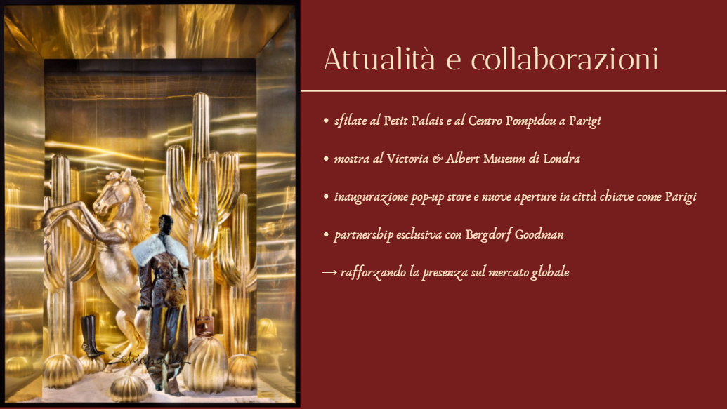 La maison ha presentato una mostra dedicata al suo patrimonio al Victoria & Albert Museum di Londra, celebrando l’eredità artistica e storica del brand. Schiaparelli continua a espandere la sua presenza digitale e fisica, con eventi e aperture in Cina e collaborazioni con influencer e artisti internazionali per rafforzare il legame tra moda, arte e cultura contemporanea.